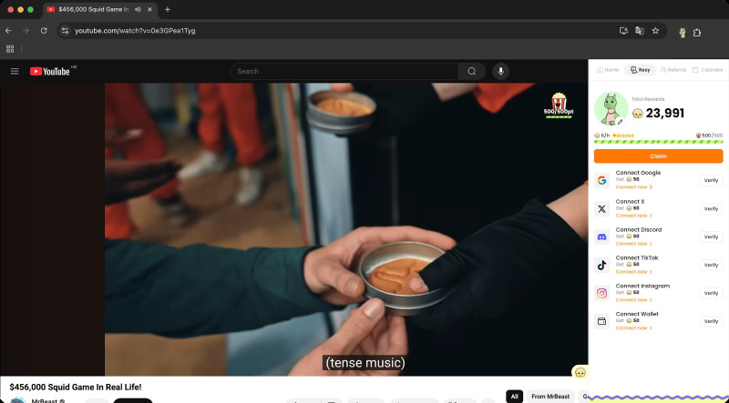 (UI screenshot: A user earning rewards while browsing YouTube with T-Rex’s browser extension.)